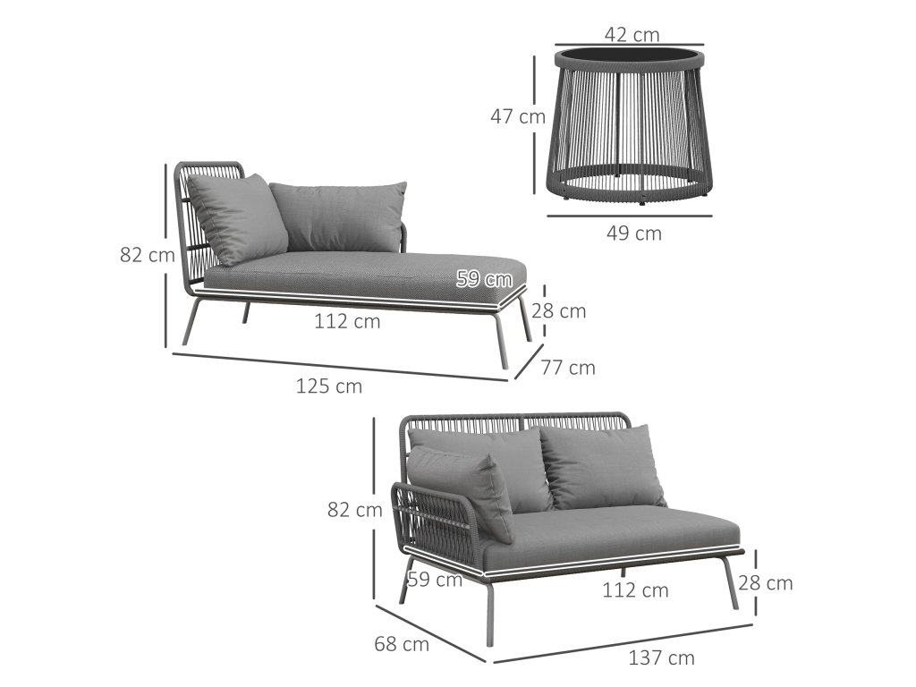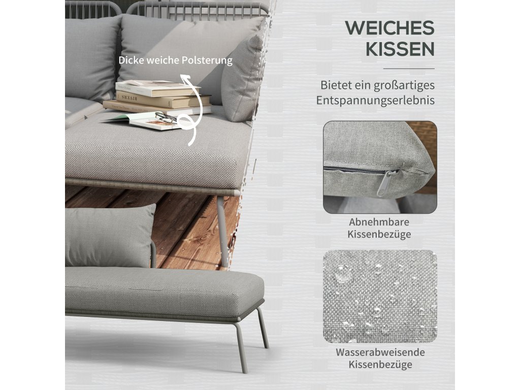 Tato elegantní venkovní rohová sedací souprava od společnosti Outsunny zaujme svou nadčasovou jednoduchostí, která se dokonale hodí téměř do každého venkovního prostředí. Pevný kovový rám poskytuje sedací soupravě maximální stabilitu, zatímco vy se zaboříte do měkkých polštářů a užijete si fantastické pohodlí pod širým nebem. Na praktickém bočním stolku je dostatek místa pro vaši oblíbenou knihu a lahodný horký nápoj, takže můžete pohodlně relaxovat a odpočívat.